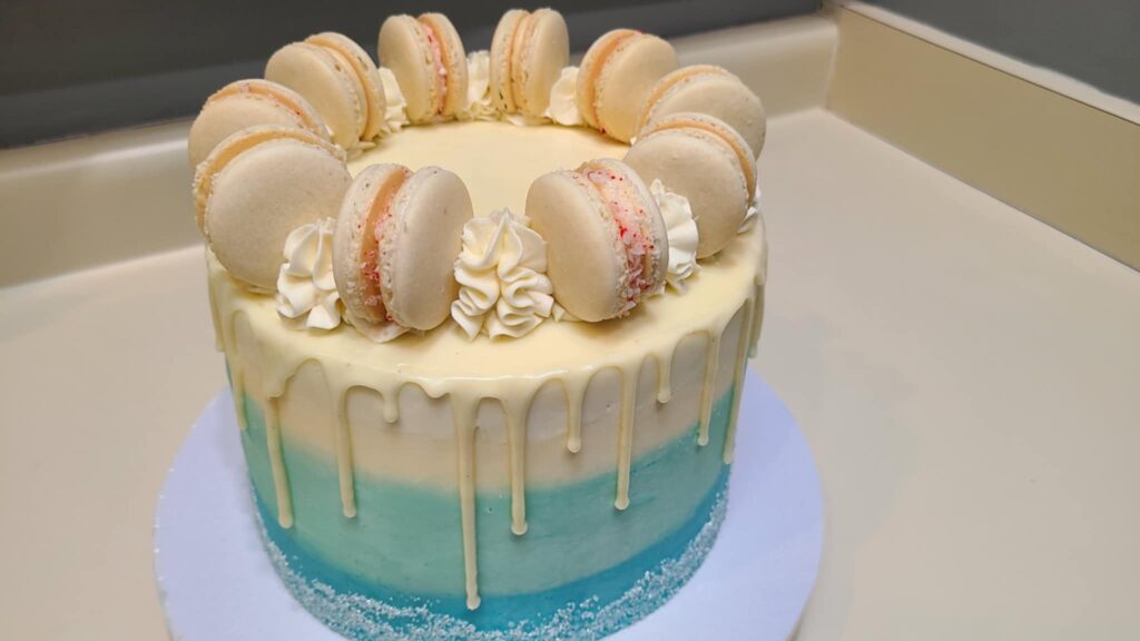 Wintery Theme, Red Velvet Cake Top with Macarons